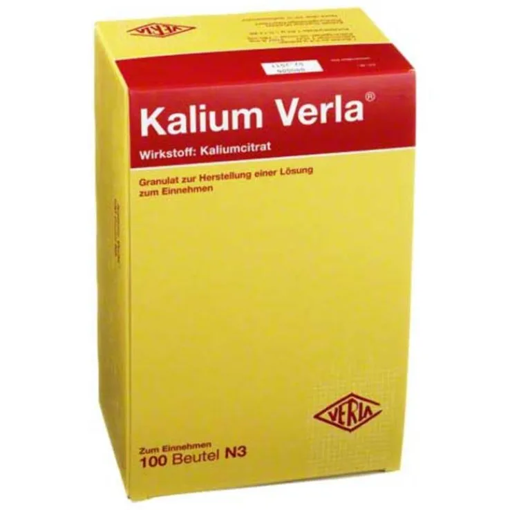 Kalium Verla® Granulat. Wirkstoff: Kaliumcitrat. Anwendungsgebiete: Kaliumersatz bei ausgeprägter Kaliumverarmung (Hypokaliämie) (Serumkalium unter 3,2 mmol/l), insbesondere bei gleichzeitig bestehender stoffwechselbedingter Übersäuerung (metabolische Azidose), bei neuromuskulären Störungen oder Herzrhythmusstörungen bei Kaliumverarmung, bei Kaliumverarmung bei gleichzeitiger Behandlung mit Digitalis. Vorbeugung einer Kaliumverarmung des Körpers (Hypokaliämie) (Serumkalium unter 3,5 mmol/l) bei stoffwechselbedingter Übersäuerung durch Ketonkörper (Ketoazidose). Hinweise: enthält Sucrose (Zucker). Zu Risiken und Nebenwirkungen lesen Sie die Packungsbeilage und fragen Sie Ihre Ärztin, Ihren Arzt oder in Ihrer Apotheke.