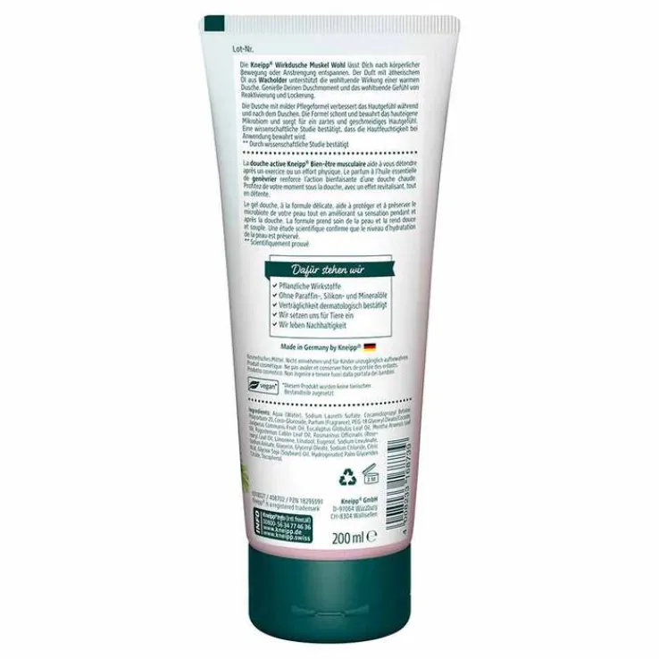 Die Kneipp Wirkdusche Muskel Wohl lässt Sie nach körperlicher Bewegung oder Anstrengung entspannen. Der Duft mit ätherischem Öl aus Wacholder unterstützt die wohltuende Wirkung einer warmen Dusche. Genießen Sie Ihren Duschmoment und das wohltuende Gefühl von Reaktivierung und Lockerung.