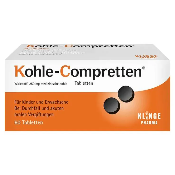 Kohle-Compretten®, Tabletten: Wirkstoff: Medizinische Kohle. Anwendungsgebiet: Akuter Durchfall; zur Verhinderung der Resorption bei oralen Vergiftungen; zur Beschleunigung der Ausscheidung bei Vergiftungen mit Stoffen, die einem enterohepatischen Kreislauf unterliegen (z.B. Carbamazepin, Phenobarbital, Phenylbutazon, Theophyllin). Warnhinweise: Enthält Saccharose u. Lactose. Arzneimittel f. Kinder unzugänglich aufbewahren. Stand: 08/23-2. Zu Risiken und Nebenwirkungen lesen Sie die Packungsbeilage und fragen Sie Ihre Ärztin, Ihren Arzt oder in Ihrer Apotheke. Klinge Pharma GmbH, 83607 Holzkirchen, Deutschland
