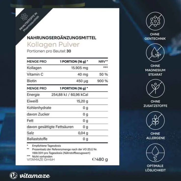 Kollagen-Hydrolysat von Rindern, Calcium L-Ascorbat, D-Biotin.