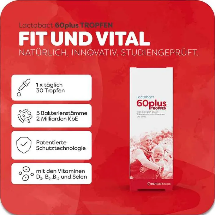 Lactobact 60plus Tropfen werden ab dem 60. Lebensjahr empfohlen.