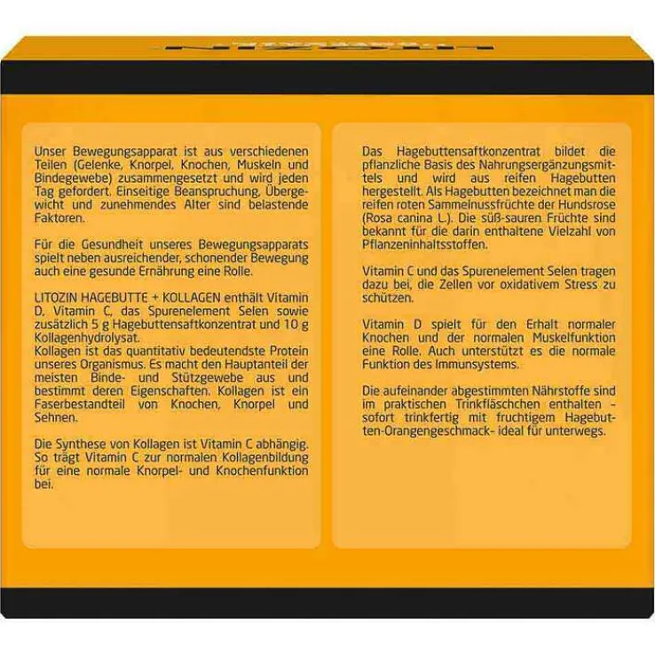 Litozin Hagebutte + Kollagen enthält Vitamin D, Vitamin C, das Spurenelement Selen sowie zusätzlich 5 g Hagebuttensaftkonzentrat und 10 g Kollagenhydrolysat.*