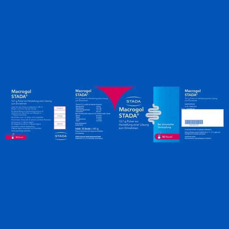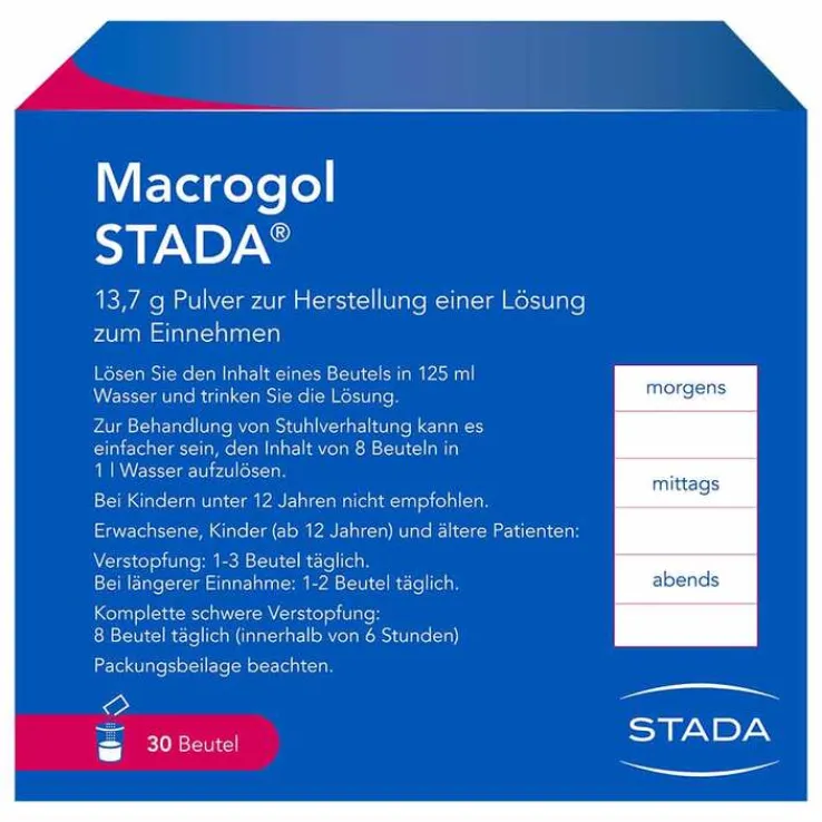 Macrogol STADA® 13,7 g Pulver zur Herstellung einer Lösung zum Einnehmen. Wirkstoffe: Macrogol 3350, Natriumchlorid, Natriumhydrogencarbonat, Kaliumchlorid. Abführmittel zur Behandlung der chronischen Verstopfung bei Erwachsenen, Kindern ab 12 Jahren und älteren Patienten. Es verhilft Ihnen zu einer unproblematischen Darmtätigkeit, selbst wenn Sie bereits über einen langen Zeitraum unter Verstopfung gelitten haben. Es wirkt auch bei einer sehr schlimmen Verstopfung, die als Stuhlverhaltung (komplette schwere Verstopfung) bezeichnet wird. Hinweis: Hoher Natriumgehalt. Enthält Kalium. Bei Kindern unter 12 Jahren nicht empfohlen. Zu Risiken und Nebenwirkungen lesen Sie bitte die Packungsbeilage und fragen Sie Ihren Arzt oder Apotheker. STADA Consumer Health Deutschland GmbH, Stadastraße 2–18, 61118 Bad Vilbel. Stand: November 2022