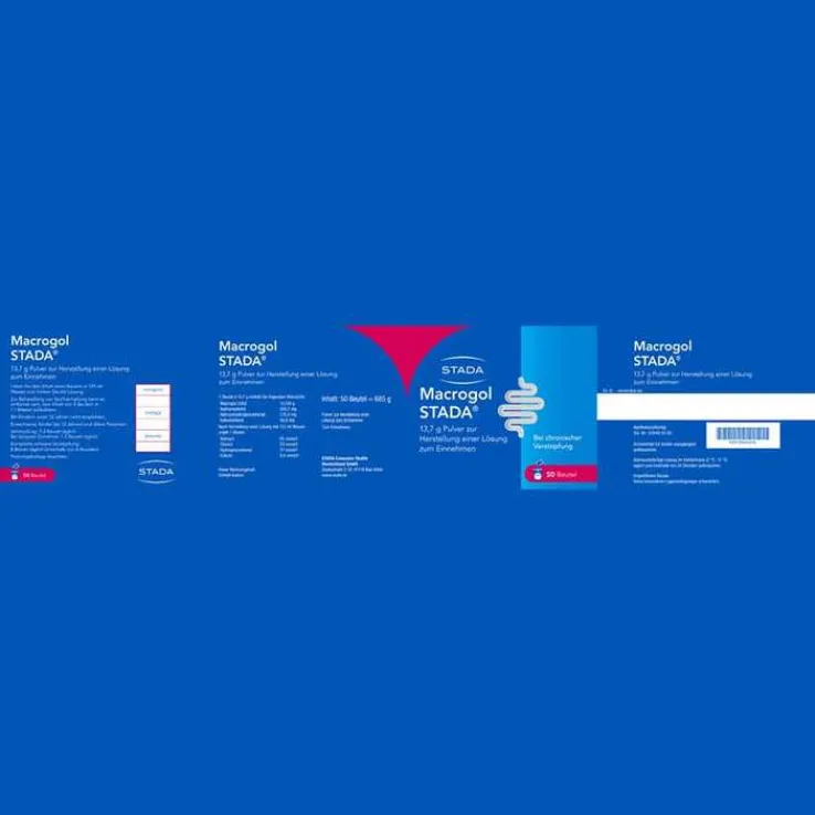 Macrogol STADA® 13,7 g Pulver zur Herstellung einer Lösung zum Einnehmen. Wirkstoffe: Macrogol 3350, Natriumchlorid, Natriumhydrogencarbonat, Kaliumchlorid. Abführmittel zur Behandlung der chronischen Verstopfung bei Erwachsenen, Kindern ab 12 Jahren und älteren Patienten. Es verhilft Ihnen zu einer unproblematischen Darmtätigkeit, selbst wenn Sie bereits über einen langen Zeitraum unter Verstopfung gelitten haben. Es wirkt auch bei einer sehr schlimmen Verstopfung, die als Stuhlverhaltung (komplette schwere Verstopfung) bezeichnet wird. Hinweis: Hoher Natriumgehalt. Enthält Kalium. Bei Kindern unter 12 Jahren nicht empfohlen. Zu Risiken und Nebenwirkungen lesen Sie bitte die Packungsbeilage und fragen Sie Ihren Arzt oder Apotheker. STADA Consumer Health Deutschland GmbH, Stadastraße 2–18, 61118 Bad Vilbel. Stand: November 2022