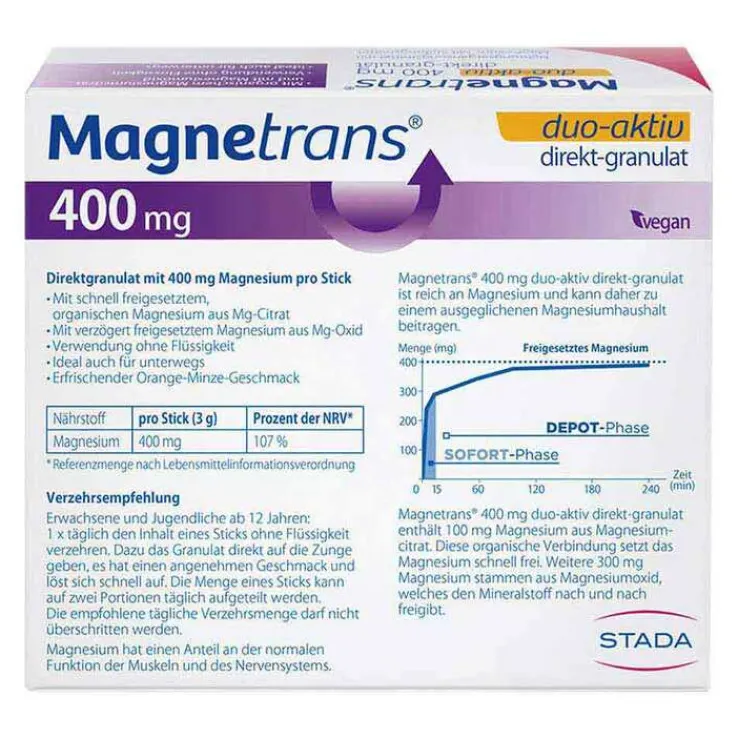 Das neue Nahrungsergänzungsmittel Magnetrans® 400 mg duo-aktiv von STADA ist ein hochdosiertes Direktgranulat. Es enthält 100 mg Magnesium aus schnell freisetzendem Magnesiumcitrat für die sofortige Magnesiumversorgung – vorteilhaft für die schnelle Regeneration. Weitere 300 mg Magnesium stammen aus langsam freisetzendem Magnesiumoxid für die kontinuierliche Magnesiumversorgung – vorteilhaft für das Auffüllen der Magnesiumdepots.