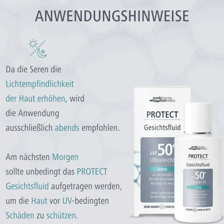 Retinal kann die Lichtempfindlichkeit der Haut erhöhen, was bedeutet, dass die Haut nach der Anwendung besonders anfällig für UV-Schäden ist. Um die optimale Wirkung der Retinal Seren zu gewährleisten und gleichzeitig die Haut vor den schädlichen Auswirkungen der Sonnenstrahlung zu schützen, ist der tägliche Gebrauch des Protect Gesichtsfluids unerlässlich. Hierfür sollten die Seren ausschließlich am Abend aufgetragen und das Gesichtsfluid am nächsten Morgen angewandt werden.