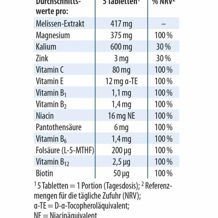 Magnesiumcitrat, Kaliumcitrat, Maltodextrin, Melissen-Extrakt (8,3 %), Magnesiumhydroxid, Trennmittel Magnesiumsalze von Speisefettsäuren (pflanzlich), Trennmittel mikrokristalline Cellulose, Vitamin C, Vitamin E, Niacin, Zinkcitrat, Pantothensäure, Vitamin B6, Vitamin B2, Vitamin B1, Folsäure (Calcium-L-Methylfolat), Biotin,Vitamin B12 (Methylcobalamin).