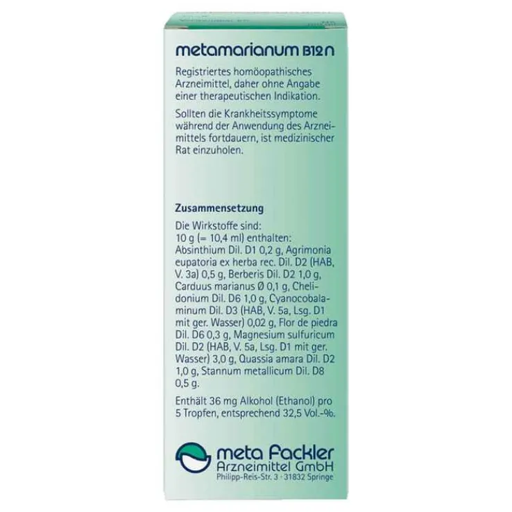 metamarianum B12 N Mischung. Anwendungsgebiete: Registriertes homöopathisches Arzneimittel, daher ohne Angabe einer therapeutischen Indikation. Enthält 36 mg Alkohol (Ethanol) pro 5 Tropfen, entsprechend 32,5 Vol.-%. Zu Risiken und Nebenwirkungen lesen Sie die Packungsbeilage und fragen Sie Ihre Ärztin, Ihren Arzt oder in Ihrer Apotheke. meta Fackler Arzneimittel GmbH, D-31832 Springe.