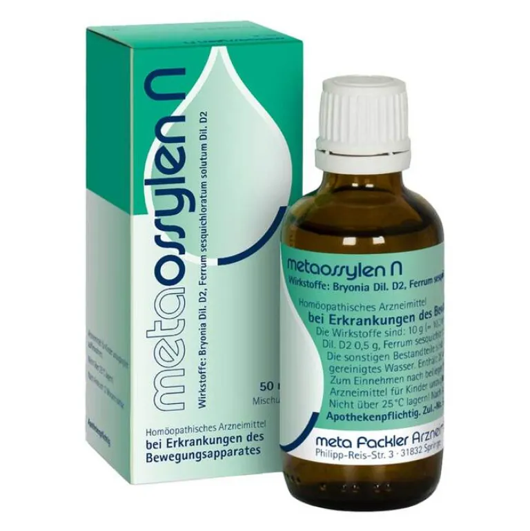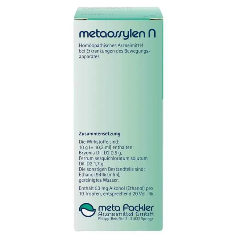 metaossylen N Mischung. Wirkstoffe: Bryonia Dil. D2, Ferrum sesquichloratum solutum Dil. D2 Die Anwendungsgebiete leiten sich von den homöopathischen Arzneimittelbildern ab. Dazu gehören: Akuter und chronischer Rheumatismus mit schmerzhafter Schulter. Hinweis: Bei akuten Gelenkbeschwerden, die z. B. mit Rötung, Schwellung oder Überwärmung einhergehen sowie bei anhaltenden, unklaren oder neu auftretenden Beschwerden sollte ein Arzt aufgesucht werden. Enthält 53 mg Alkohol (Ethanol) pro 10 Tropfen, entsprechen 20 Vol.-%. Zu Risiken und Nebenwirkungen lesen Sie die Packungsbeilage und fragen Sie Ihre Ärztin, Ihren Arzt oder in Ihrer Apotheke. meta Fackler Arzneimittel GmbH, D-31832 Springe.