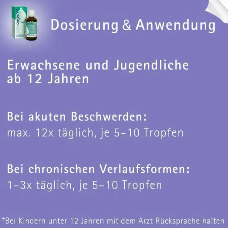 Bei akuten Zuständen alle halbe bis ganze Stunde, höchstens 12mal täglich, je 5–10 Tropfen einnehmen. Bei chronischen Verlaufsformen 1–3mal täglich 5–10 Tropfen.