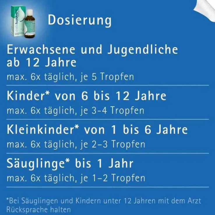 Bei chronischen Verlaufsformen 1 bis 3mal täglich je 5 Tropfen einnehmen. Bei Besserung der Beschwerden ist die Häufigkeit der Anwendung zu reduzieren.