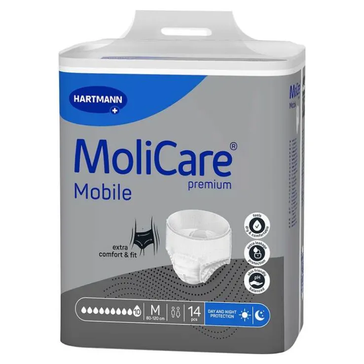 Die Inkontinenzhosen MoliCare® premium Mobile 10 Tropfen bieten zuverlässigen Auslaufschutz bei Tag und Nacht für Erwachsene, die unter starker Inkontinenz leiden.