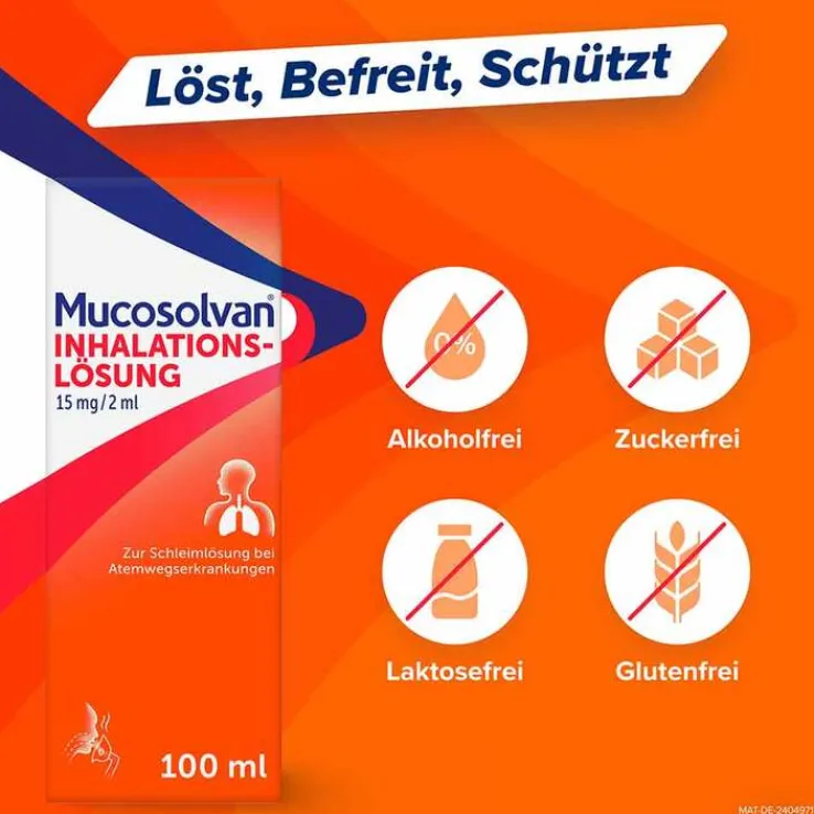 Mucosolvan® Inhalationslösung 15 mg/2 ml.Wirkstoff: Ambroxolhydrochlorid. Anwendungsgebiet: Zur Schleim lösenden Behandlung bei akuten und chronischen Erkrankungen der Bronchien und der Lunge mit zähem Schleim. Warnhinweis: Enthält Benzalkoniumchlorid. Apothekenpflichtig.Zu Risiken und Nebenwirkungen lesen Sie die Packungsbeilage und fragen Sie Ihre Ärztin, Ihren Arzt oder in Ihrer Apotheke.A. Nattermann & Cie. GmbH, Brüningstraße 50, 65929 Frankfurt am Main. Stand: Juli 2022