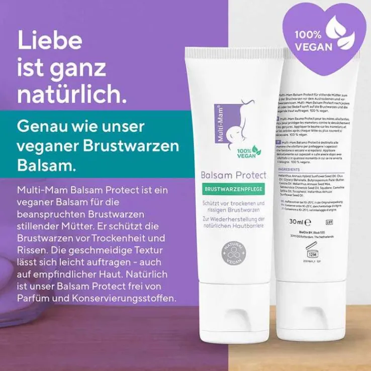 Der vegane Brustwarzen-Balsam Multi-Mam Balsam Protect basiert hauptsächlich auf pflanzlichen Ölen und Fetten und schützt die Brustwarzen während des Stillens optimal vor Trockenheit und Rissen.