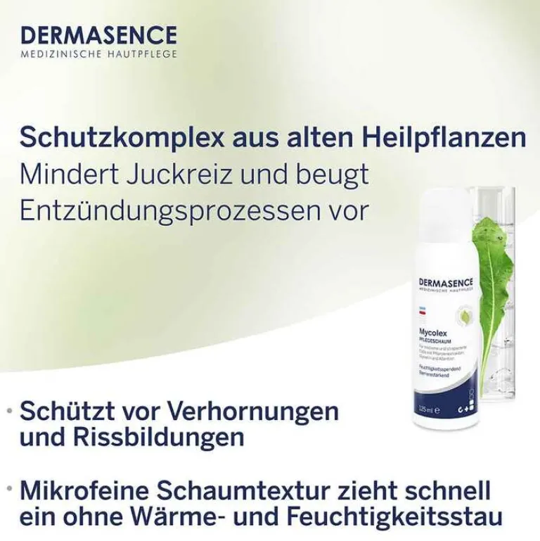 Ein Schutzkomplex aus alten Heilpflanzen mindert den Juckreiz und beugt Entzündungsprozessen vor. Die Haut wird vor übermäßigen Verhornungen und Rissbildungen geschützt und die Hautbarriere langfristig gestärkt und widerstandsfähiger gemacht. Die mikrofeine Schaumtextur verursacht keinen Wärme und Feuchtigkeitsstau und zieht sofort ein. Es besteht somit keine Rutschgefahr. Dermasence Mycolex Pflegeschaum ist dermatologisch getestet und parfümfrei.