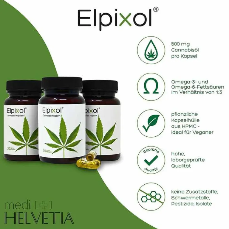 Die Elpixol Cannabis-Kapseln sind die perfekte pflanzliche Alternative für alle, die sich gesund ernähren und einen aktiven Lebensstil führen wollen. Sie enthalten Hanfsamenöl, das ein wertvolles Öl ist. Es ist reich an Mineralien, Vitaminen und den essenziellen Fettsäuren Omega-3- , Omega-6- und Omega-9-Fettsäure, die der Körper nicht selbst herstellen kann.