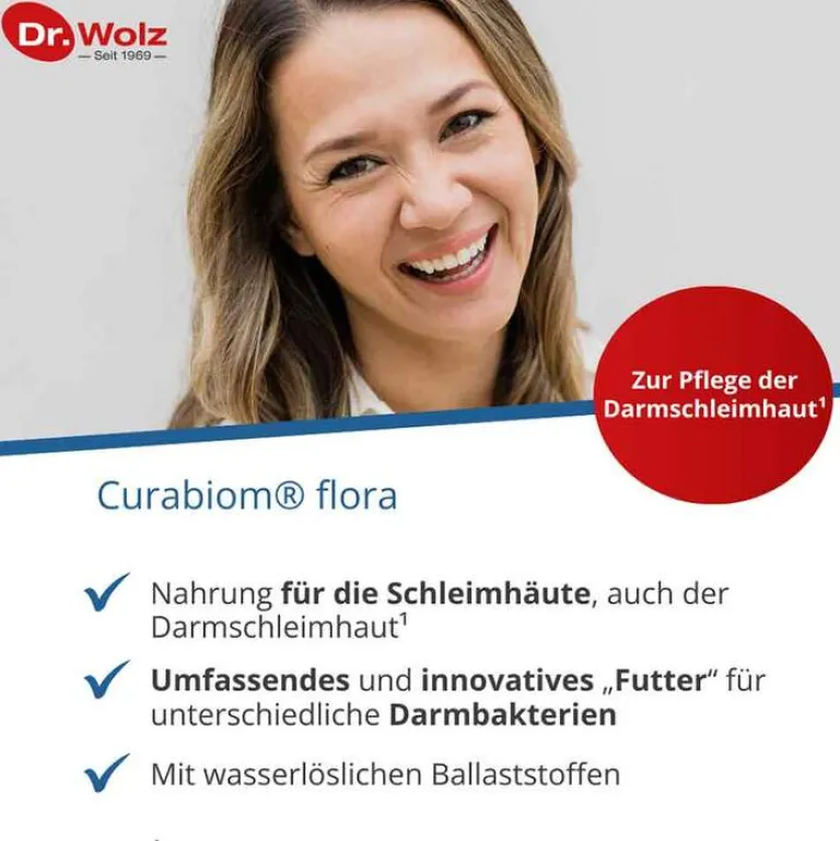 Kapseln Curabiom® flora duo Darmkur: Zwei Kapseln enthalten 50 Milliarden Milchsäurebakterien sowie 0,55 mg Vitamin B1, 0,70 mg Vitamin B2, 0,70 mg Vitamin B6, 2,5 µg Vitamin B12, 50 µg Biotin und 100 µg Folsäure.