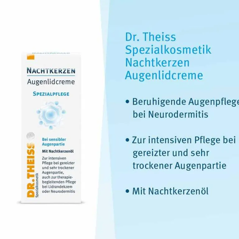 Gerade die Augenpartie ist bei Neurodermitis häufig besonders angegriffen. Neben sehr trockener und gereizter Haut können Lidrandekzeme entstehen. Dr. Theiss Nachtkerzen Augenlidcreme spendet der trockenen Augenpartie mit Panthenol und Glycerin intensiv Feuchtigkeit und regeneriert die Haut. Ein pflanzlicher Komplex wirkt beruhigend und kann Juckreiz lindern.