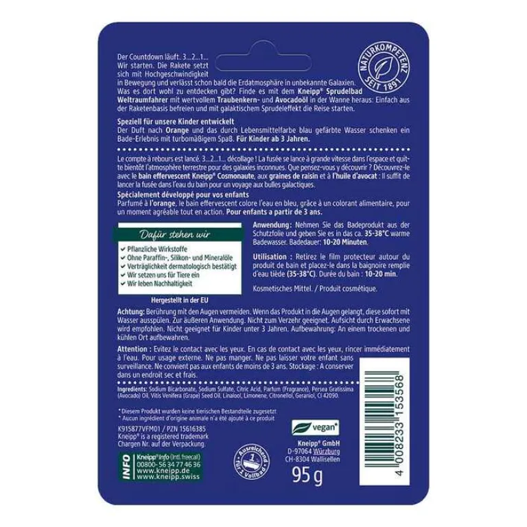 Der Countdown läuft. 3…2…1… Wir starten. Die Rakete setzt sich mit Hochgeschwindigkeit in Bewegung und verlässt schon bald die Erdatmosphäre in unbekannte Galaxien. Was es dort wohl zu entdecken gibt? Finde es mit dem Kneipp® Sprudelbad Weltraumfahrer mit wertvollem Traubenkern- und Avocadoöl in der Wanne heraus: Einfach aus der Raketenbasis befreien und mit galaktischem Sprudeleffekt die Reise starten.Speziell für unsere Kinder entwickelt. Der Duft nach Orange und das durch Lebensmittelfarbe blau gefärbte Wasser schenken ein Bade-Erlebnis mit turbomäßigem Spaß. Für Kinder ab 3 Jahren.