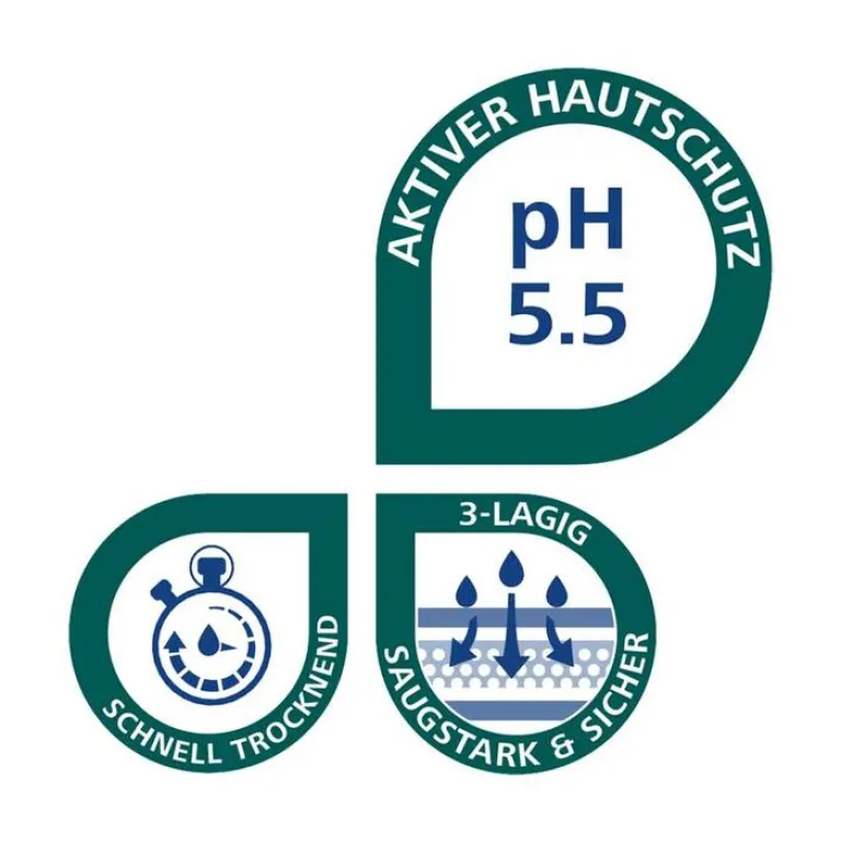 „Oberseite Polypropylen-Vlies, hydrophil, weiß, Saugkern: Zellstoff* , Superabsorbierendes Polymer, pH-Puffermittel, Vlies, hydrophil, weiß, Rückseite: Atmungsaktive textile Rückseite, weiß Elastische Teile: Gummizug, weiß (Lycra HyFit), Innenbündchen: Polypropylen-Vlies, hydrophob, weiß (ausgenommen 2 Tropfen) Klebstoffe: Schmelzkraftkleber Trägerpapier: Silikonpapier *elementarchlorfrei gebleicht“