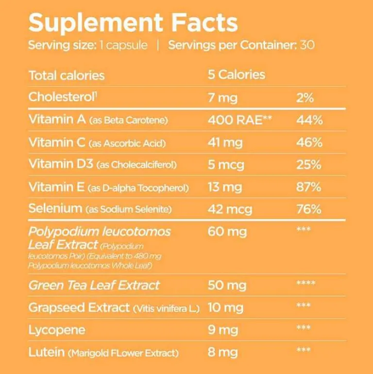 Gelatine, Sonnenblumenöl, Feuchthaltemittel (E 422), Polypodium leucotomos Poir Extrakt (7,8 %), Lycopin (1,0 %), Camellia sinensis L. Kuntze Extrakt (6,5 %), Emulgator (E 322), L-Ascorbinsäure (Vitamin C), Lutein (1,0 %), Verdickungsmittel (E 341), D- α-Tocopherol (Vitamin E), Triglyceride, ß-Carotin (Vitamin A), Vitis vinifera L. Extrakt (1,3 %), Emulgator (E 901), Farbstoff (E 172), Farbstoff (E 171), Cholecalciferol (Vitamin D), Natriumselenit (Selen).