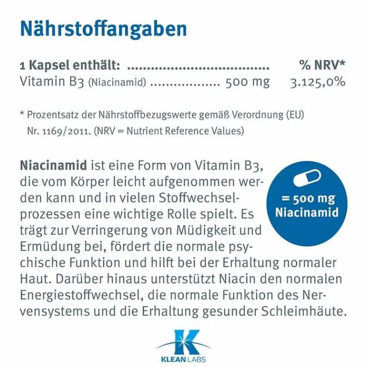 Niacinamid, Kapselhülle: Gelatine, Füllstoff: mikrokristalline Cellulose, Trennmittel: Magnesiumstearat.