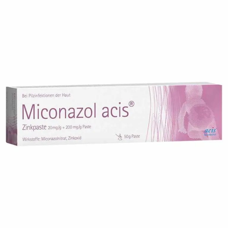 Miconazol acis® Zinkpaste Wirkstoffe: Miconazolnitrat 20 mg/g, Zinkoxid 200mg/g Paste. Anwendungsgebiete: Zur Behandlung schwerer Formen der Windeldermatitis, bei der eine nachgewiesene Besiedlung mit Hefepilzen (Candida spp.) im Vordergrund steht. Miconazol acis Zinkpaste wird angewendet bei Säuglingen, Kindern und Erwachsenen. Warnhinweise: Enthält Propylenglycol. Zu Risiken und Nebenwirkungen lesen Sie die Packungsbeilage und fragen Sie Ihre Ärztin, Ihren Arzt oder in Ihrer Apotheke. Stand: 01/2020.