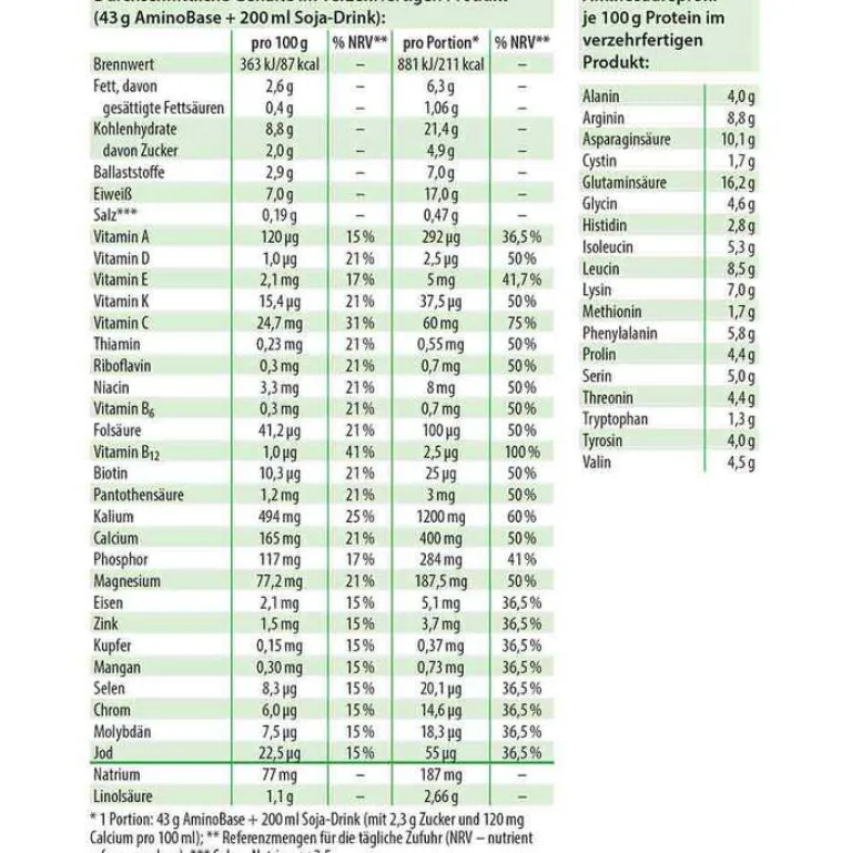 | * Tagesportion = 43 g AminoBase + 200 ml Soja-Drink (mit 2,3 g Zucker und 120 mg Calcium pro 100 ml) | ||