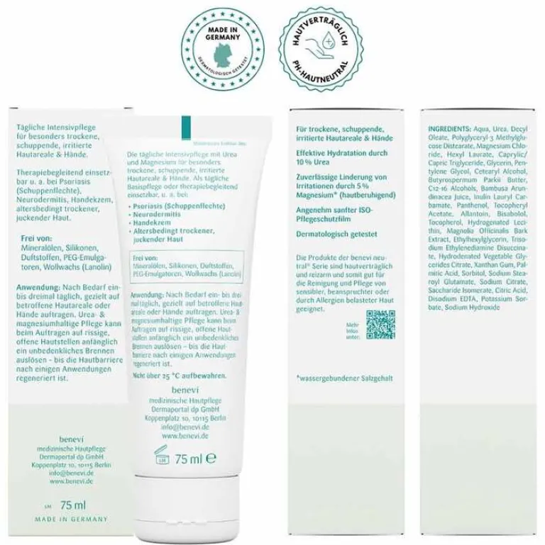 Benevi Neutral ISO-Intensivcreme ist eine Intensivpflege bei trockener, gereizter Haut – vielseitig einsetzbar bei Juckreiz & Schuppung – 10% Urea, 5% Magnesiumsalz.