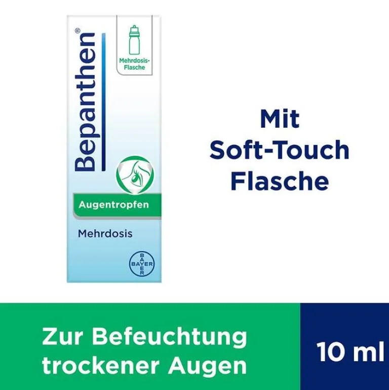 Wer an trockenen und gereizten Augen leidet, kann mit den Bepanthen® Augentropfen die Augenoberfläche befeuchten, den Tränenfilm stabilisieren und somit das Auge vor einem Trockenheitsgefühl schützen. Auf diese Weise wird eine Linderung der Beschwerden erreicht. Die Bepanthen® Augentropfen sind erhältlich als Ein-Dosis-Behältnis (praktisch für unterwegs) und in der Soft-Touch-Mehrdosisflache (insbesondere zur regelmäßigen Anwendung). Die Augentropfen enthalten weder Konservierungsstoffe noch Phosphate. Sie sind für Kontaktlinsenträger geeignet.