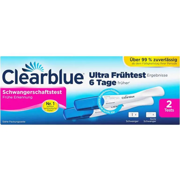 Bei dem Clearblue Schwangerschaftstest Frühe Erkennung handelt es sich um einen Test, mit dem bereits 6 Tage vor dem Ausbleiben der Periode eine Schwangerschaft nachgewiesen werden kann (d. h. 5 Tage vor Fälligkeit der Periode). - Über 99 % Zuverlässigkeit
