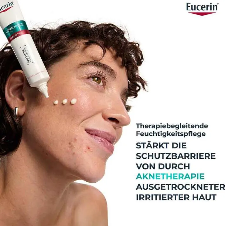 Die Eucerin® DERMOPURE CLINICAL Hydra Repair Therapiebegleitende Feuchtigkeitspflege 40 ml ist eine Gesichtspflege speziell für Menschen, die sich aufgrund unreiner Haut und Akne in medikamentöser Behandlung befinden. Infolge dieser Aknetherapie kann die Haut sehr trocken werden und auch gerötet oder irritiert reagieren. Die Gesichtscreme mildert diese Nebenwirkungen mit einer effektiven Wirkstoffkombination aus SymSITIVE* und Ceramiden. Sie stellt die ausgetrocknete Schutzbarriere der Haut wieder her, mildert Hautirritationen und reduziert Spannungen sowie Rötungen.