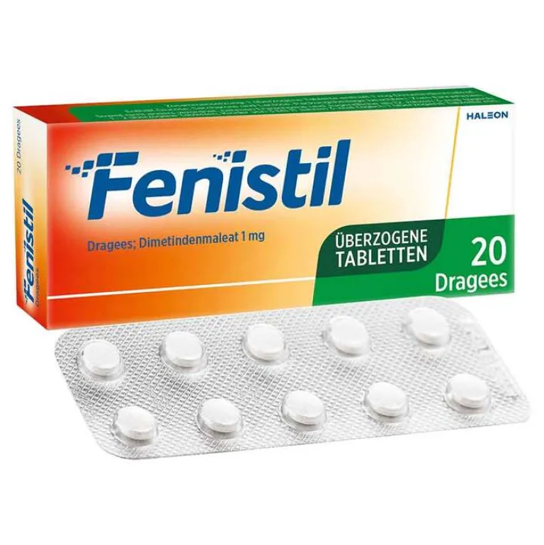 Fenistil Dragees. Wirkstoff: Dimetindenmaleat. Anwendungsgebiete: Zur symptomatischen Linderung von histaminbedingtem Juckreiz; windpockenassoziiertem Juckreiz bei Kleinkindern; allergischem Schnupfen bei Patienten über 6 Jahren; Nesselsucht (Urtikaria). Warnhinweis Enthält Glucose, Sucrose (Zucker) und Lactose. Apothekenpflichtig. Stand: 05/2018. Zu Risiken und Nebenwirkungen lesen Sie die Packungsbeilage und fragen Sie Ihre Ärztin, Ihren Arzt oder in Ihrer Apotheke.