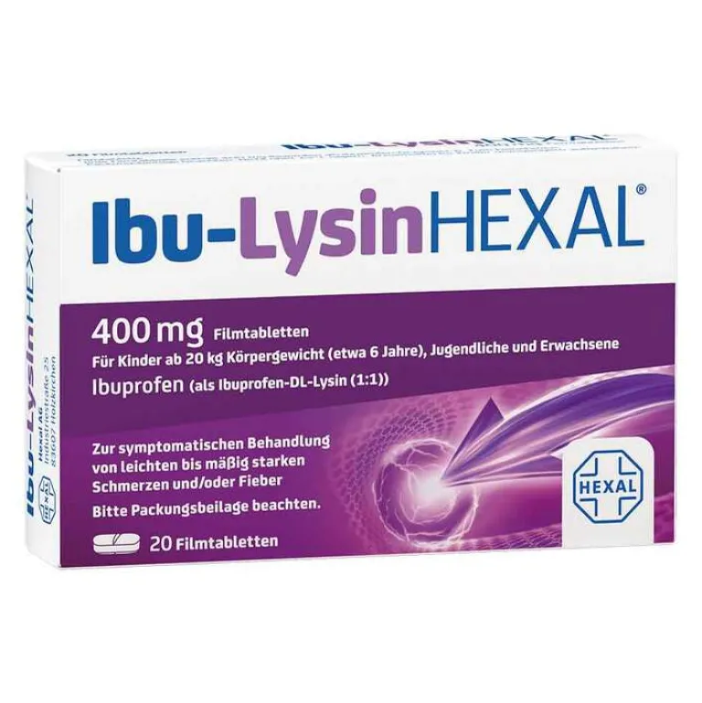 Ibu-Lysin HEXAL® 400 mg Filmtabletten, Wirkstoff: Ibuprofen (als Ibuprofen-DL-Lysin (1:1)). Anwendungsgebiete: Symptomatische Behandlung von leichten bis mäßig starken Schmerzen wie Kopfschmerzen, Zahnschmerzen, Regelschmerzen sowie Fieber und Schmerzen im Zusammenhang mit Erkältungen. Symptomatische Behandlung der akuten Kopfschmerzphase bei Migräne mit oder ohne Aura. Zur Anwendung bei Kindern ab 20 kg Körpergewicht (etwa 6 Jahre), Jugendlichen und Erwachsenen. Warnhinweis: Bei Schmerzen oder Fieber ohne ärztlichen Rat nicht länger anwenden als in der Packungsbeilage vorgegeben! Zu Risiken und Nebenwirkungen lesen Sie die Packungsbeilage und fragen Sie Ihre Ärztin, Ihren Arzt oder in Ihrer Apotheke! Mat.-Nr.: 2/51016383 Stand: Januar 2024 Hexal AG, 83607 Holzkirchen, www.hexal.de