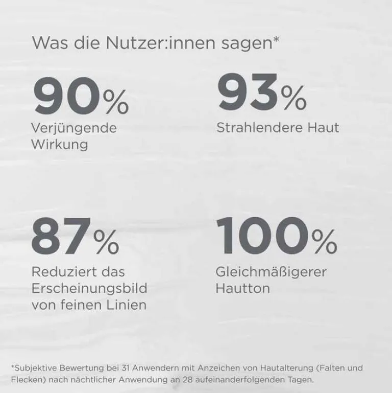 ¹ Subjektive Bewertung bei 31 Anwender:innen mit Anzeichen von Hautalterung (Falten und Flecken) nach nächtlicher Anwendung an 28 aufeinanderfolgenden Tagen.