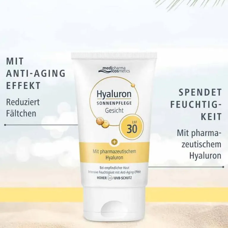 Die Hyaluron Sonnenpflege Gesicht LSF 30 von medipharma cosmetics ist eine feuchtigkeitsspendende Sonnencreme, die empfindliche und trockene Haut schützt, pflegt und gleichzeitig einen zuverlässigen UV-Schutz bietet – perfekt für sonnige Tage und Reisen.