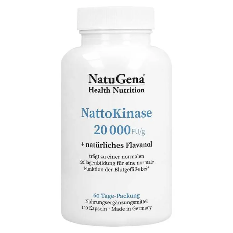 NatuGena NattoKinase 20 000 kombiniert Nattokinase mit Kakao-Extrakt (50 % Flavanole) und natürlichem Vitamin C aus Camu-Camu-Extrakt. Das enthaltene Vitamin C trägt zu einer normalen Kollagenbildung für eine normale Funktion der Blutgefäße bei.