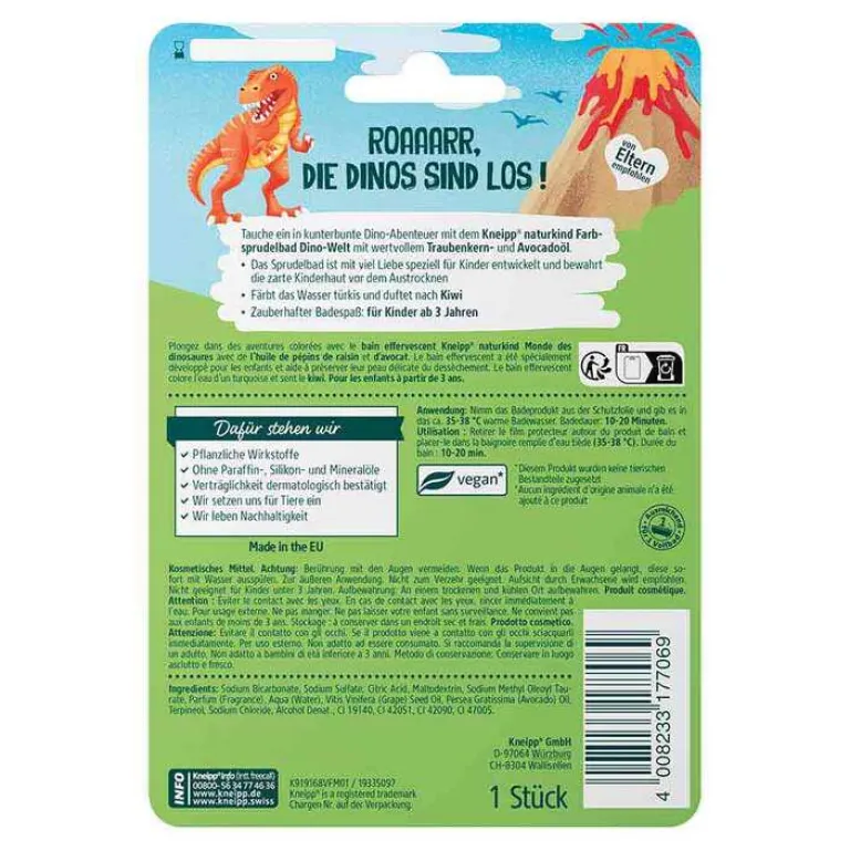 Das Eintauchen in die kunterbunte Dinowelt – mit dem Kneipp naturkind Dinowelt Sprudelbad ist das möglich! Das Sprudelbad ist mit wertvollem Traubenkern- und Avocadoöl. Es ist mit viel Liebe speziell für Kinder entwickelt worden und bewahrt die zarte Kinderhaut vor dem Austrocknen.