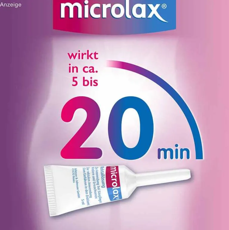 Microlax Rektallösung Klistiere.Anwendungsgebiete: Zur kurzfristigen Anwendung bei Verstopfung (Obstipation) sowie bei Erkrankungen, die eine erleichterte Stuhlentleerung (Defäkation) erfordern. Zur Darmentleerung bei diagnostischen oder therapeutischen Maßnahmen im Enddarmbereich. Warnhinweise: Enthält Sorbinsäure. Zu Risiken und Nebenwirkungen lesen Sie die Packungsbeilage und fragen Sie Ihre Ärztin, Ihren Arzt oder in Ihrer Apotheke. Kenvue Germany GmbH, 41470 Neuss. Stand: 05/2025