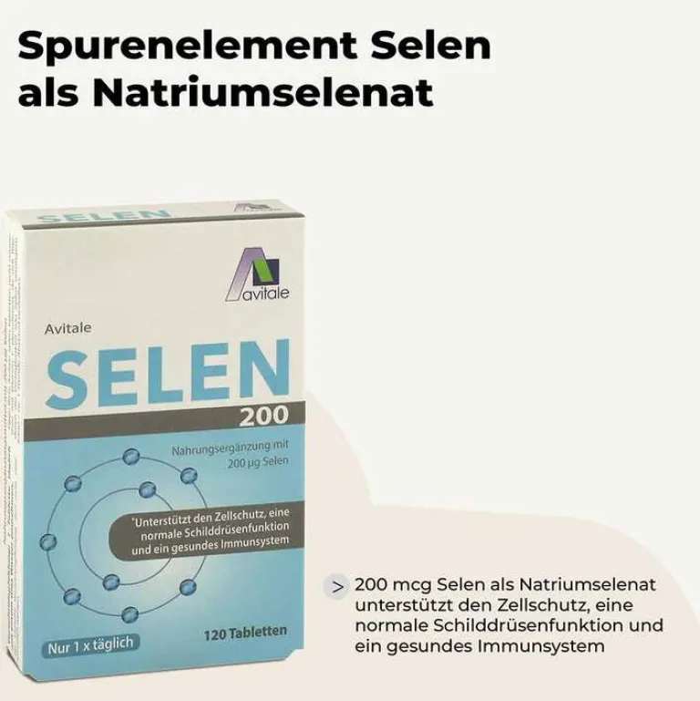 Selen kommt sowohl in tierischen als auch in pflanzlichen Nahrungsmitteln vor. Der menschliche Körper kann es nicht selbst bilden, er muss es regelmäßig über selenhaltige Lebensmittel aufnehmen. Avitale Selen Tabletten liefern mit 200 mcg Selen als Natriumselenit eine gute Versorgung wichtiger Körperfunktionen mit diesem essentiellen Spurenelement.