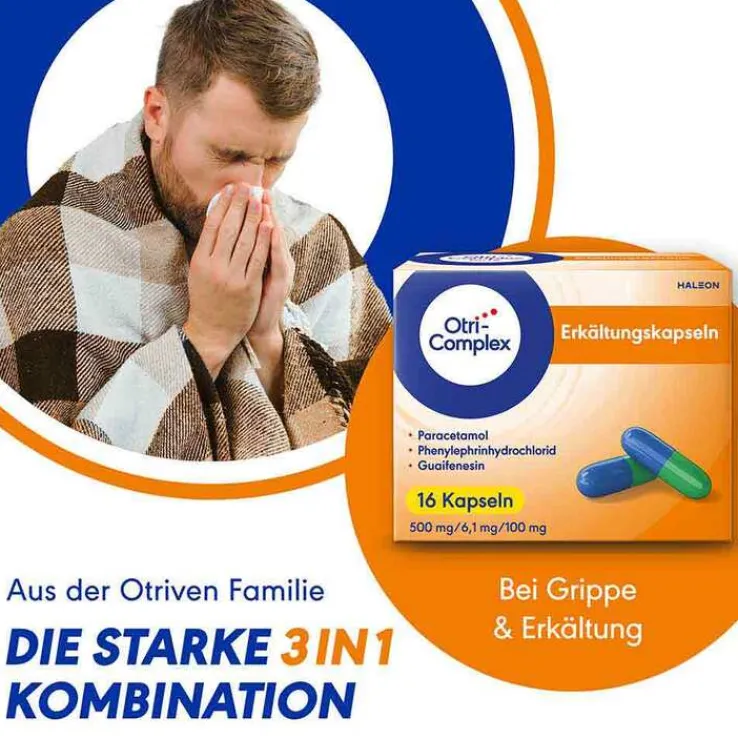 OtriComplex Erkältungskapseln Wirkstoffe: Paracetamol, Phenylephrinhydrochlorid, Guaifenesin. Anwendungsgebiete: Zur kurzfristigen Behandlung von Erkältung, Schüttelfrost und Grippe, einschließlich leichte bis mäßig starke Schmerzen, Fieber und Schleimhautschwellung der Nase, mit schleimlösender Wirkung bei festsitzendem Erkältungshusten. OtriComplex Erkältungskapseln sind indiziert zur Anwendung bei Erwachsenen und Jugendlichen ab 16 Jahren. Warnhinweis: Ohne ärztlichen Rat nicht länger anwenden als in der Packungsbeilage vorgegeben! Apothekenpflichtig. Stand: 01/2024. Zu Risiken und Nebenwirkungen lesen Sie die Packungsbeilage und fragen Sie Ihre Ärztin, Ihren Arzt oder in Ihrer Apotheke.