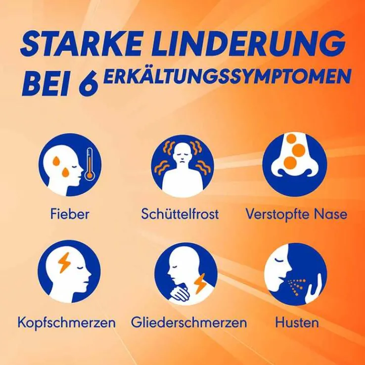 Starke Linderung bei den 6 häufigsten Erkältungssymptomen: Fieber, Schüttelfrost, verstopfte Nase, Kopfschmerzen, Gliederschmerzen und Husten