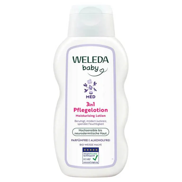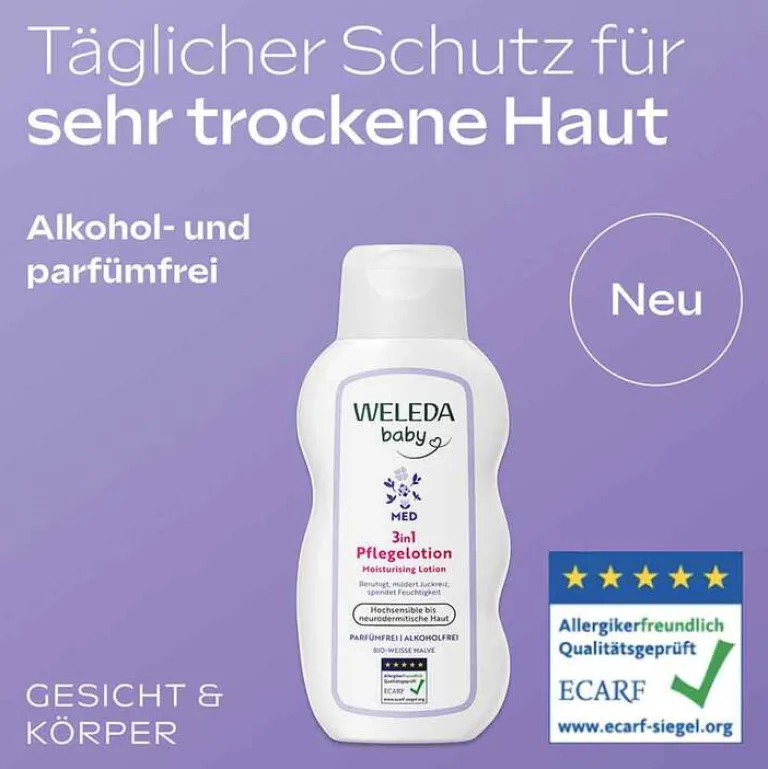 Schenken Sie der hochsensiblen bis neurodermitischen Haut Ihres Babys mit der Med 3in1 Pflegelotion weiße Malve von Weleda Baby verwöhnende Feuchtigkeit! Ihre Formel mit wertvollen Inhaltsstoffen wie Bio-Weisse Malve, Bio-Nachtkerzenöl und Extrakt aus Mondo Graswurzel beruhigt die Haut, schützt und stärkt die Hautbarriere. Gleichzeitig reduziert sie Rötungen und mindert Juckreiz. Die Pflegelotion zieht schnell ein und klebt nicht.