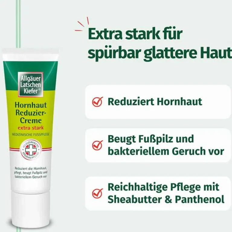 Die Hornhaut Reduziercreme extra stark von Allgäuer Latschenkiefer wirkt besonders kraftvoll bei der Reduzierung störender Hornhaut. Ihre wirksame Anti-Hornhaut-Formel kombiniert Fruchtsäuren und Weidenrindenextrakt, um Hornhaut gezielt zu verringern. Durch ihre Wirkung verbessert die Creme spürbar das Hautgefühl.