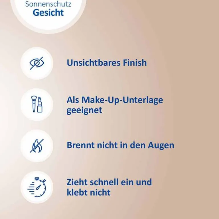 Tragen Sie die Sonnenschutz-Creme großzügig auf das Gesicht, den Hals, das Dekollete und die Hände auf. Vor dem Auftrag von Make-Up oder anderen Gesichtsprodukten gut einziehen lassen. Cremen Sie nach Bedarf nach – vor allem nach dem Baden oder Schwitzen. Zu wenig Sonnenschutzmittel verringert den Lichtschutzfaktor.
