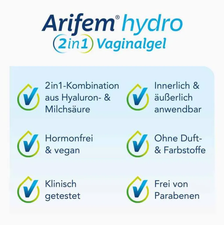 Die Symptome der Scheidentrockenheit können die Lebensqualität der betroffenen Frauen stark beeinträchtigen. Vielfach ist durch diese Beschwerden auch der Geschlechtsverkehr unangenehm oder sogar schmerzhaft. Arifem® hydro 2in1 Vaginalgel kann diese Beschwerden lindern und zur Erleichterung des Geschlechtsverkehrs angewendet werden.