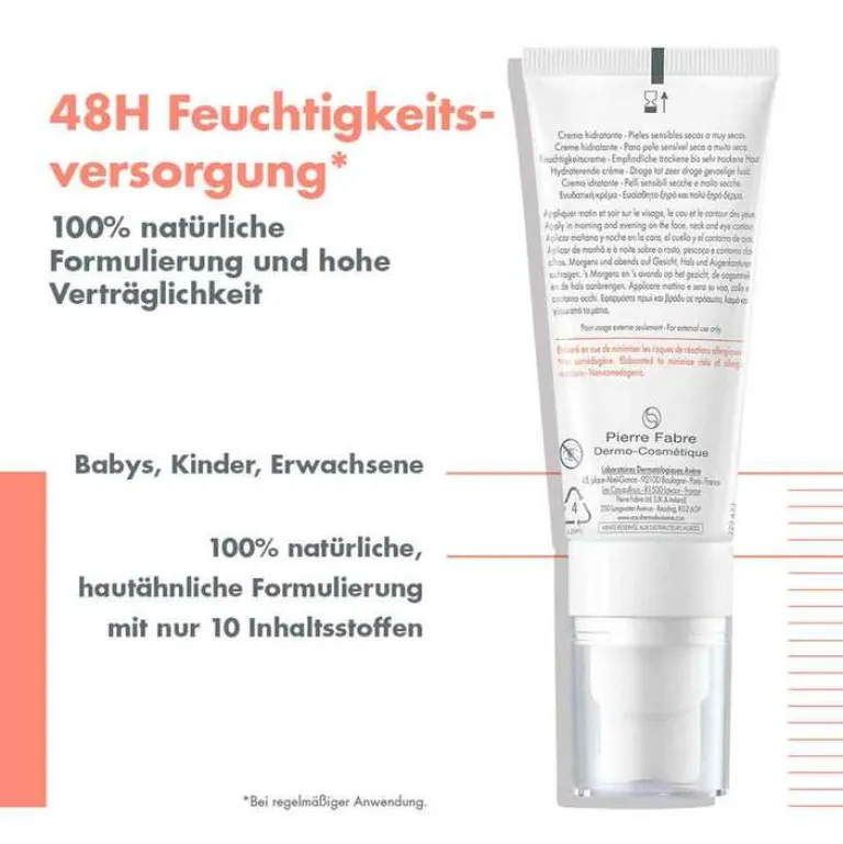 Diese Creme kombiniert natürliche Inhaltsstoffe, die die Haut beruhigen und intensiv mit Feuchtigkeit versorgen. Die einzigartige Zusammensetzung unterstützt die Haut bei der Wiederherstellung ihres natürlichen Gleichgewichts und bietet eine langanhaltende Hydratation (Feuchtigkeitsversorgung). Zu diesem Zweck enthält die Creme hochmolekulare Hyaluronsäure, die bis zum Tausendfachen ihres eigenen Gewichts an Wasser aufnimmt. Ebenfalls enthalten ist Eau Thermale Avène Thermalwasser, das die Haut beruhigt und erfrischt. Die einzigartige Kombination der Aktivstoffe führt bei regelmäßiger Anwendung zu einer gesünder aussehenden Haut mit verbesserter Elastizität und Strahlkraft.