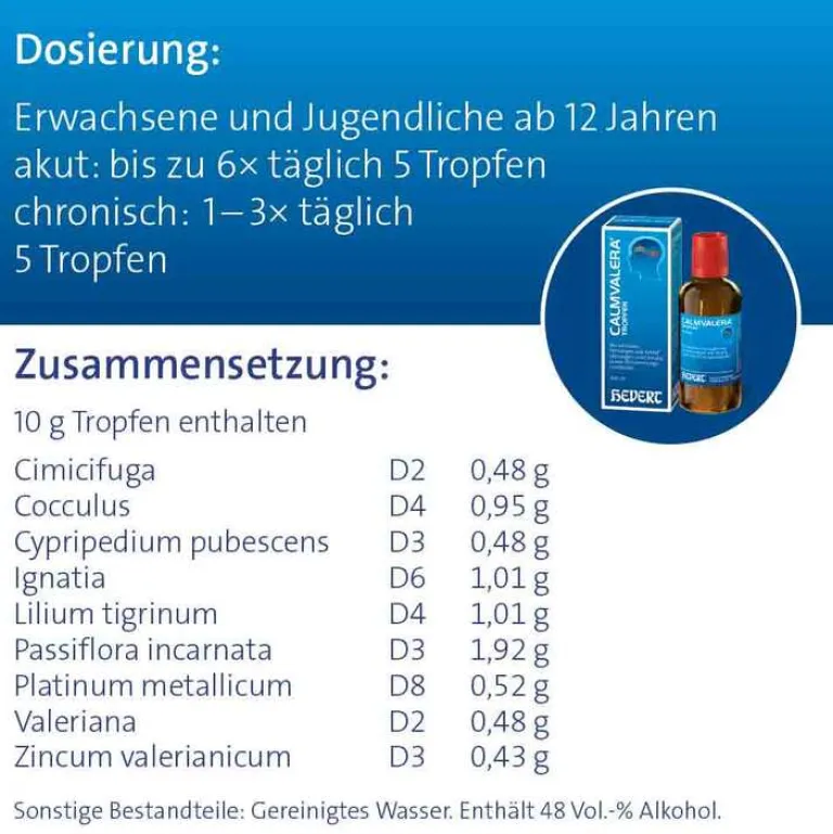 Calmvalera® Tropfen Die Anwendungsgebiete leiten sich von den homöopathischen Arzneimittelbildern ab. Dazu gehören: Nervöse Störungen wie Schlafstörungen und Unruhe, Verstimmungszustände. Enthält 48 Vol.-% Alkohol. Zu Risiken und Nebenwirkungen lesen Sie die Packungsbeilage und fragen Sie Ihre Ärztin, Ihren Arzt oder in Ihrer Apotheke.