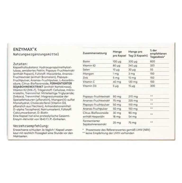 Kapselhüllsubstanz: Hydroxypropylmethylcellulose, amidiertes Pektin; Papaya-Fruchtextrakt (enthält Papain), Füllstoff: Maisstärke, Ananas-Fruchtextrakt (enthält Bromelain), Papaya-Fruchtpulver, Ananas-Fruchtpulver, L-Ascorbinsäure, Citrus-Bioflavonoide, fermentierter Sojabohnenextrakt (enthält Nattokinase), Vitamin K2 (MK-7), Trägerstoff: Cellulose, mikrokristallin, Trennmittel: Mittelkettige Triglyceride; Zinkoxid, Trennmittel: Magnesiumsalze der Speisefettsäuren (pflanzlich), Mangan(II)-sulfat Monohydrat, Cholecalciferol (Vitamin D3, pflanzlich aus Flechten), Antioxidationsmittel: D-alpha Tocopherol; Natriumselenit, Füllstoff: Calciumcarbonat; D-Biotin