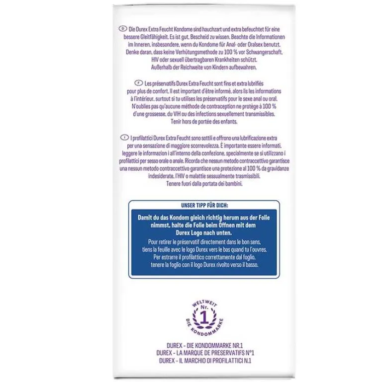 Die Durex extra feucht Kondome sind hauchzart und extra befeuchtet für eine bessere Gleitfähigkeit.